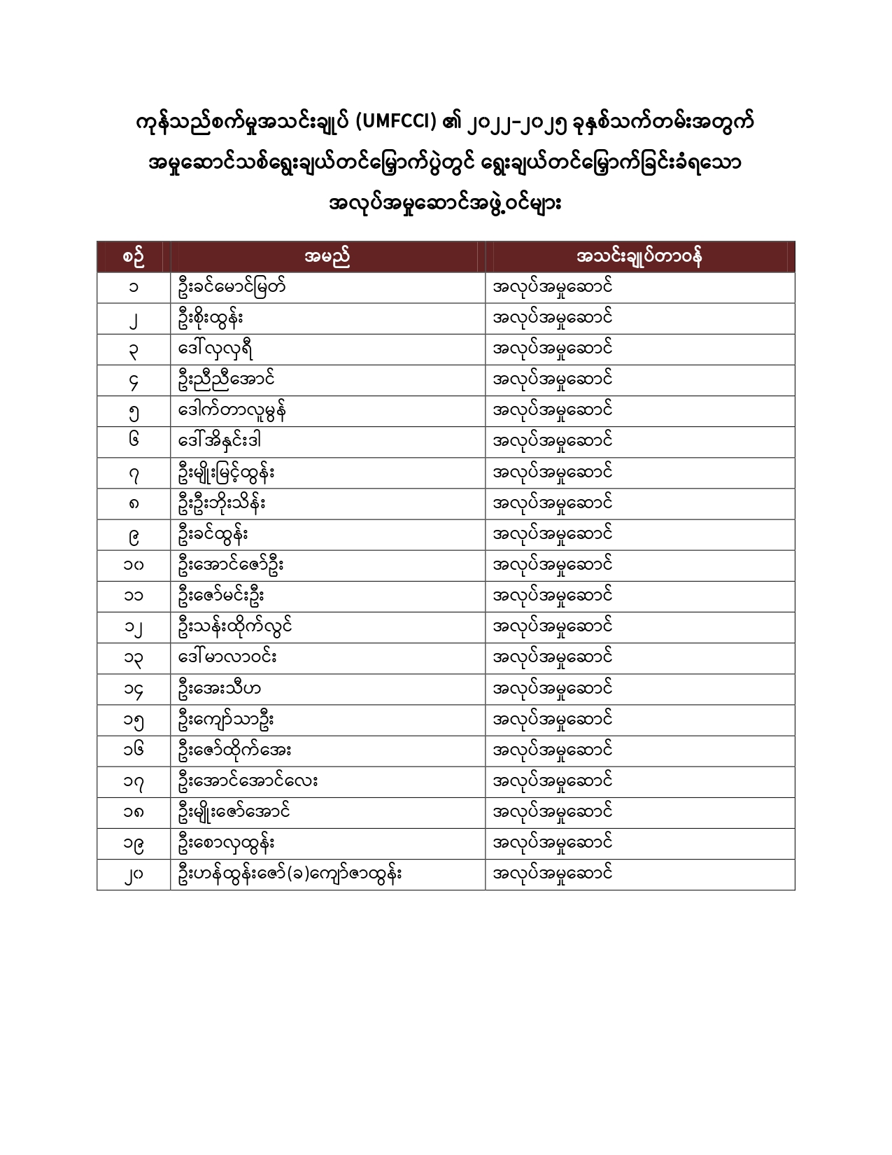 ကုန်သည်စက်မှုအသင်းချုပ် (UMFCCI) ၏ ၂၀၂၂-၂၀၂၅ ခုနှစ်သက်တမ်းအတွက် အလုပ်အမှုဆောင်အဖွဲ့ဝင်များစာရင်း